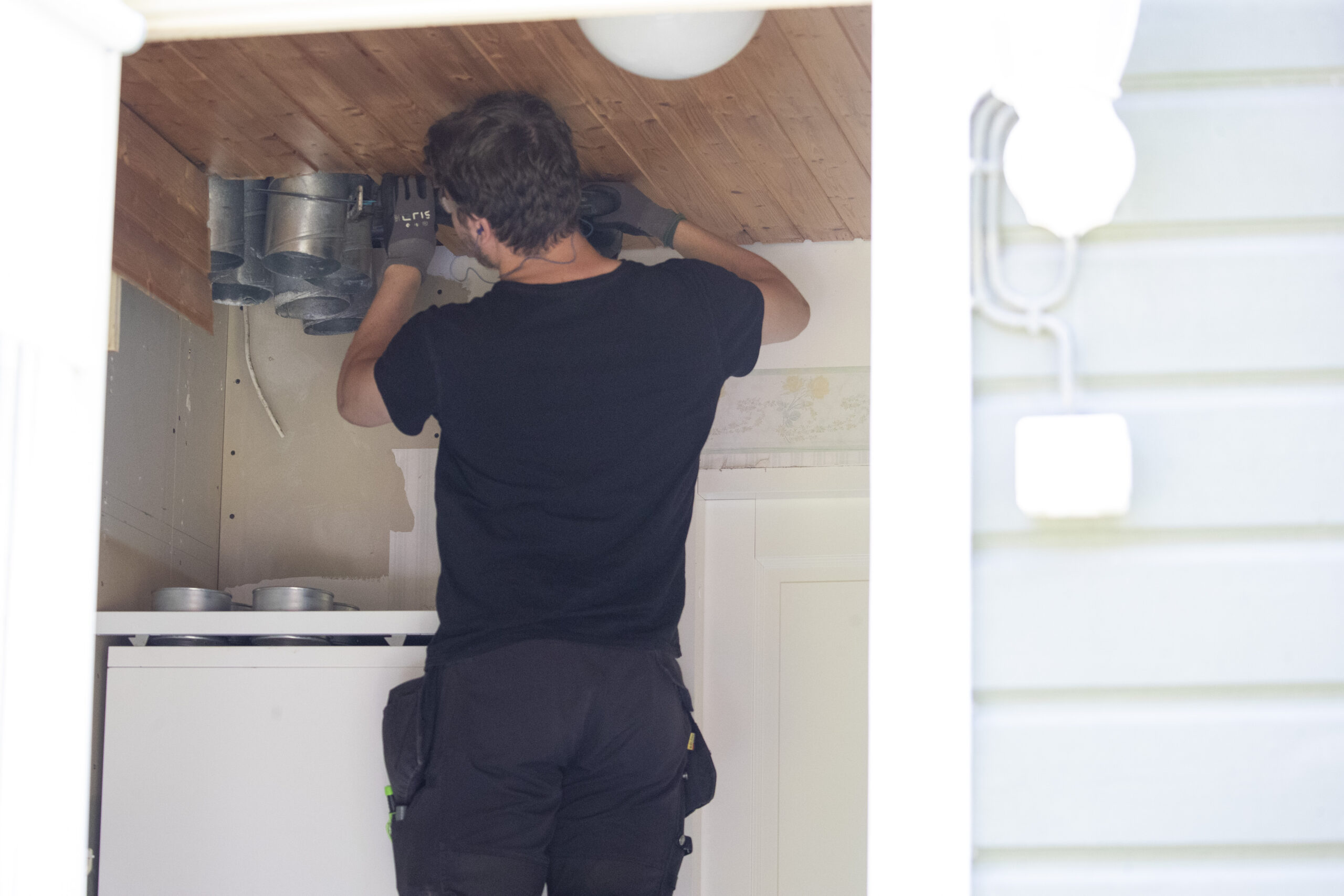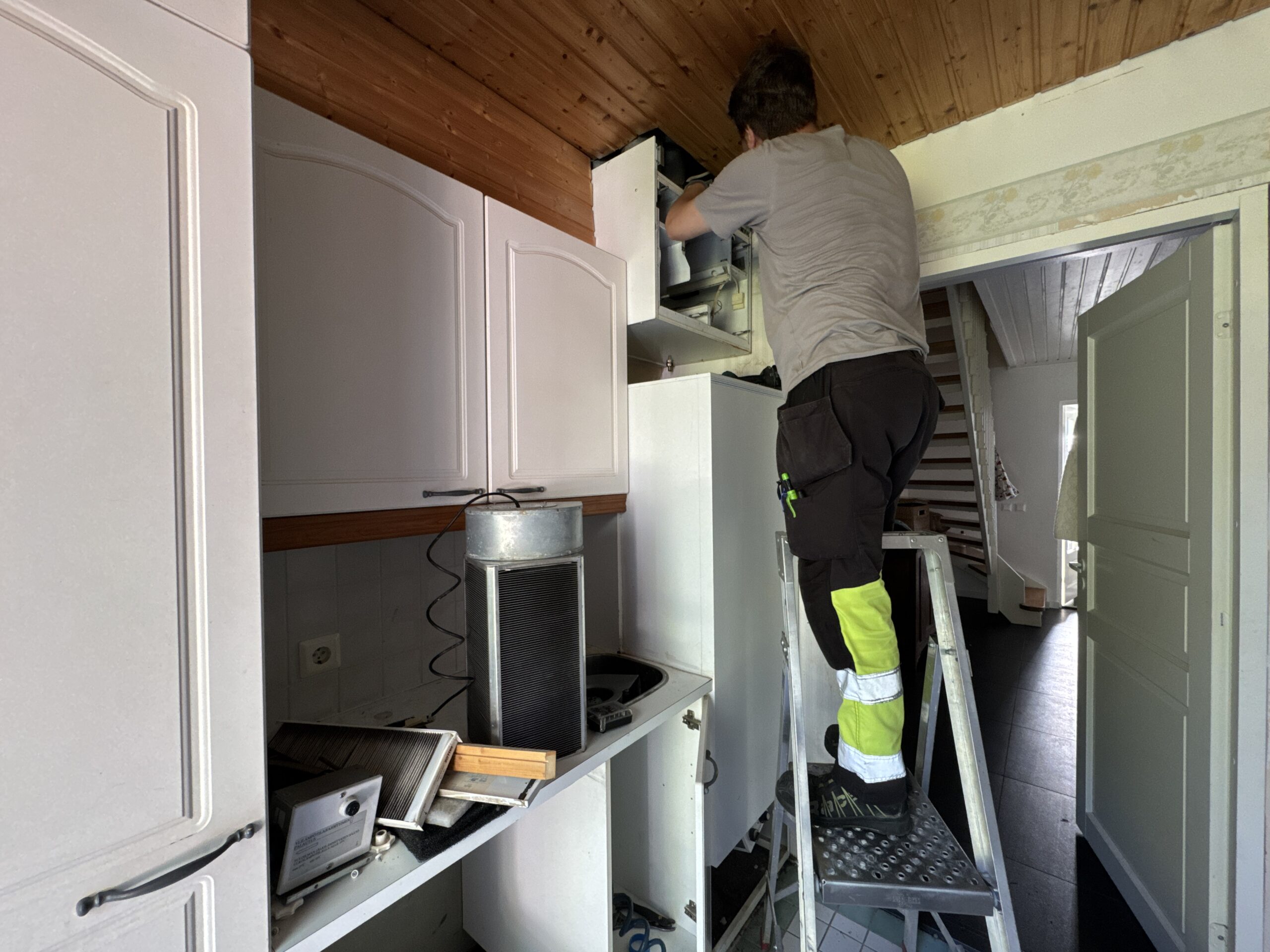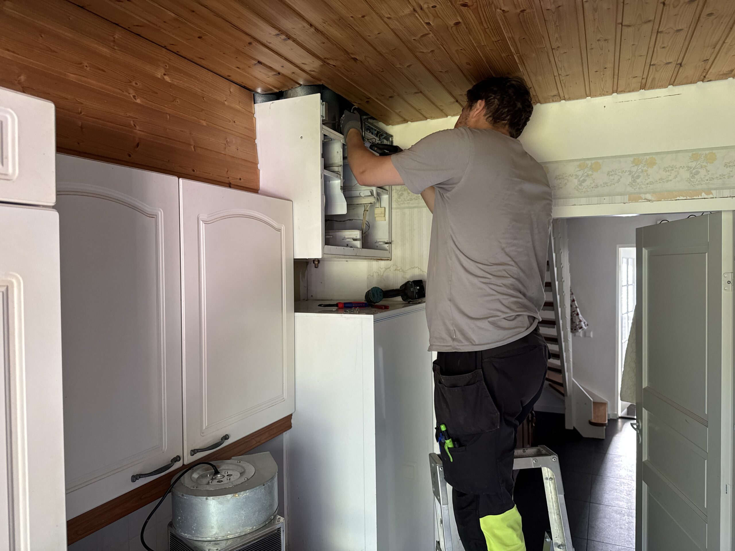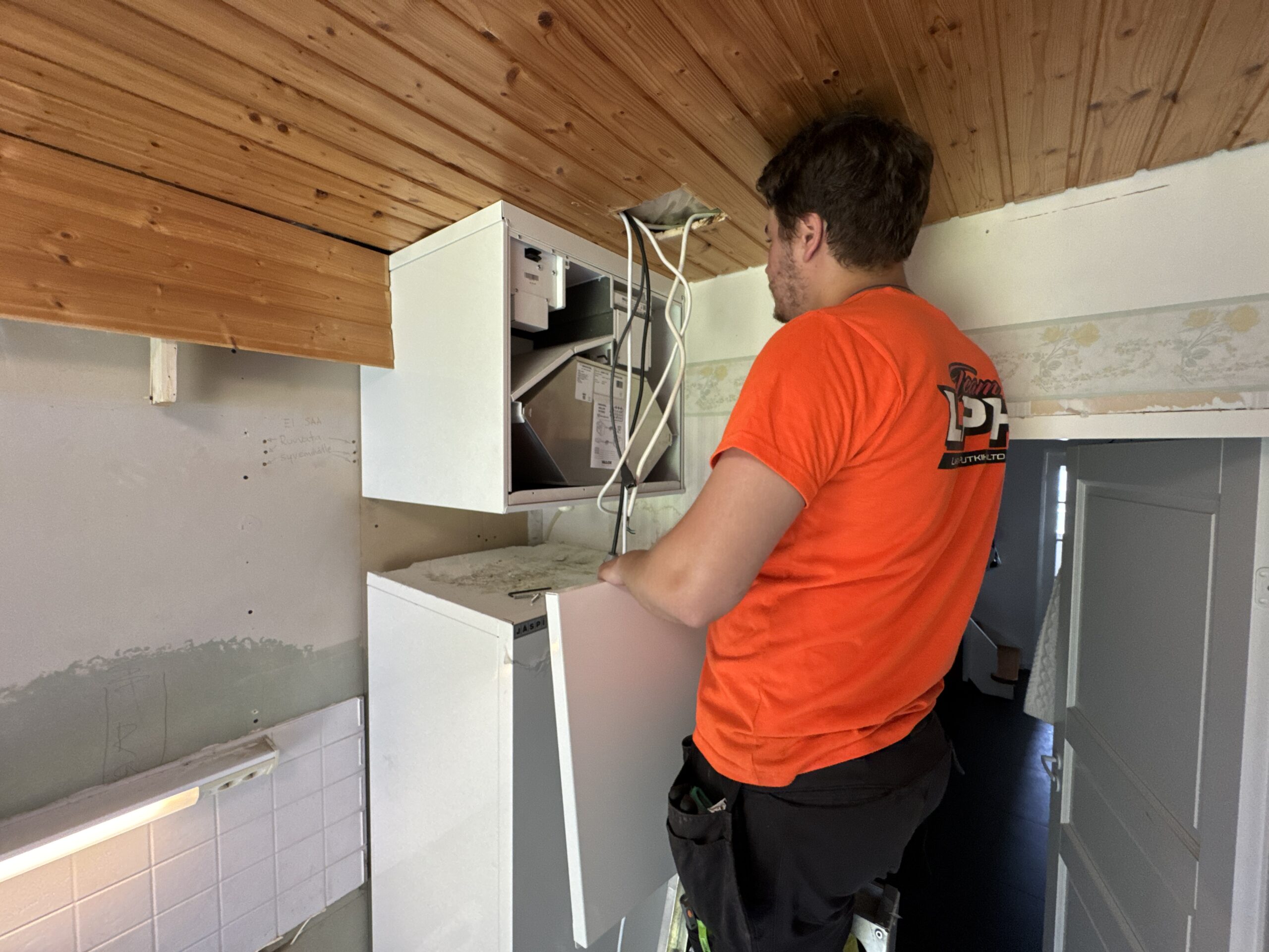 – Ensin tyhjennettiin vanha varaaja ja saatiin se pois paikaltaan. Sitten purettiin ilmanvaihtokone. Vasta sen jälkeen päästiin asentamaan uusi Valloxin kone, Jami kertoo.